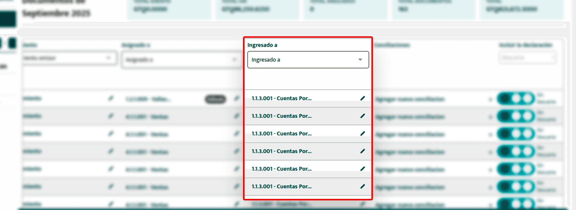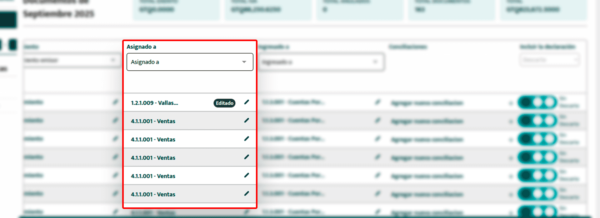 Haz click en el ícono de lápiz. Se desplegará una lista con las cuentas disponibles en tu nomenclatura contable. Selecciona la cuenta deseada y el cambio se aplicará automáticamente.