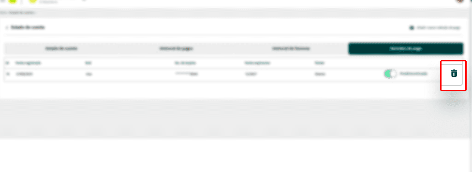 Si deseas eliminar alguna tarjeta, solo debes hacer clic en el ícono de basurero que aparece al lado derecho del método de pago correspondiente.