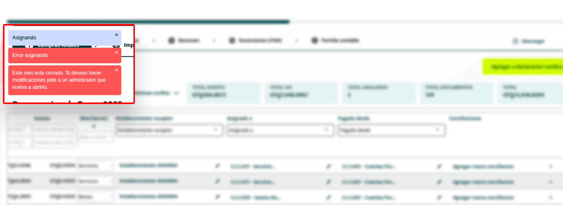 3.2 Si aun así intentas modificar la clasificación (cambiar una cuenta o editar información), verás un mensaje en rojo informando que no puedes realizar modificaciones porque el mes se encuentra cerrado.