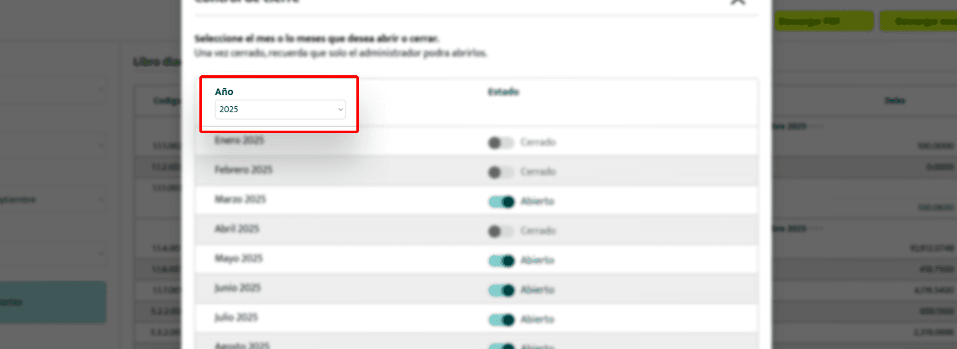 De esta manera puedes identificar fácilmente qué meses están disponibles para modificaciones y cuáles ya se encuentran bloqueados por cierre.