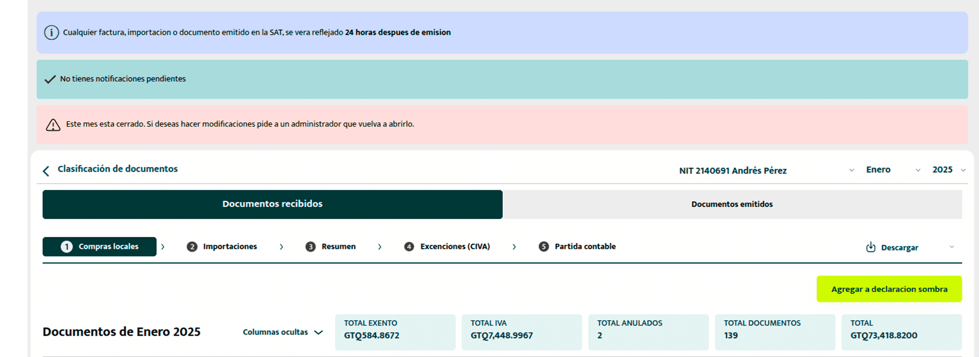 3.1 Si intentas hacer un cambio en Documentos Recibidos o Documentos Emitidos, al cambiar de mes en la parte superior del módulo de clasificación de documentos, el sistema mostrará una advertencia indicando que el mes está cerrado.